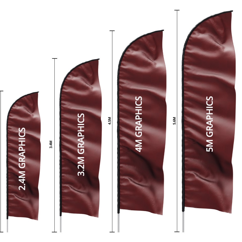 Our feather flags are offered in a diverse array of sizes, ranging from a modest 2.4m tall to an impressive XL size of 5m tall! Opt for single or double-sided printing for maximum two-way exposure, with hemmed edges providing additional reinforcement for double-sided prints. Customize your order by selecting a flag with or without a base. Our base options encompass cross-type, ground spike, double ground spike, drive-on-foot, as well as 15L, 20L, or 30L water-fill alternatives. Order your personalised feather flags online! Then simply send us your artwork file or let our professional designers help! Our artwork rates are competitively priced and we can send you a design draft within 2 days. If you still wish to provide your own artwork you can send us your file for a free artwork print suitability check!Feather Shape